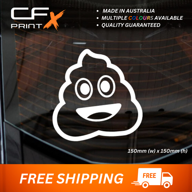 Customise your ride with our epic decals from CFX Print.  This HAPPY POO Funny decal is sure to impress.  Multiple colours available via the drop down menu.